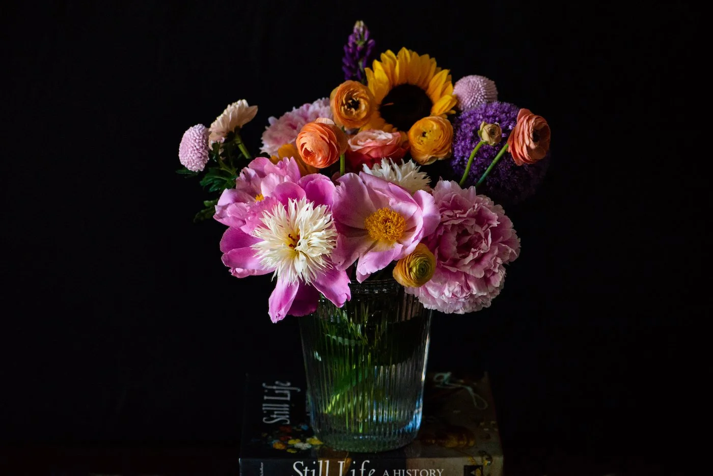 I often get in the right frame of mind, as you know, by listening to or reading an On Being program. Today I tuned into the Listening Party celebration. Kind of hard not to get teary-eyed listening but as always, worth the emotions. I’ve been inspired by On Being and so grateful to Krista Tippett et al for what they have shared. I’ve been inspired to share things here in part because of that whole mode, you know? And of course by other stuff too. One can’t work in a library and not be a person who shares. Also inspiring are book blogs, like Kerry Clare’s, and blogs like The Marginalian, and then while social media can be a lot, it also offers up some beautiful inspiration for me in the form of poetry, quotations, etc. Today’s post is just going to be a selection of things I’ve found lately, thoughts inspired from my online wanderings, and maybe a couple of poems thrown in for good measure, alongside the backdrop of this photo of a mix of peonies from our garden, and some flowers from our favourite florist.