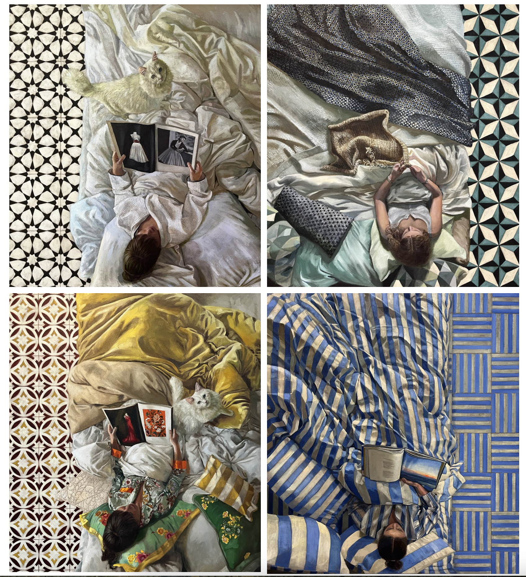 I love that the figures are reading books in most of these. And even the iPhone! I love the perspective, the patterns, the way the fabric is painted. And let me reiterate, the books! A dream. I love that there is the unknowable moment — why is the woman in bed? Is she just luxuriating? or recuperating? Is it self-care? Or escape? Day dreaming? Could be so many things.