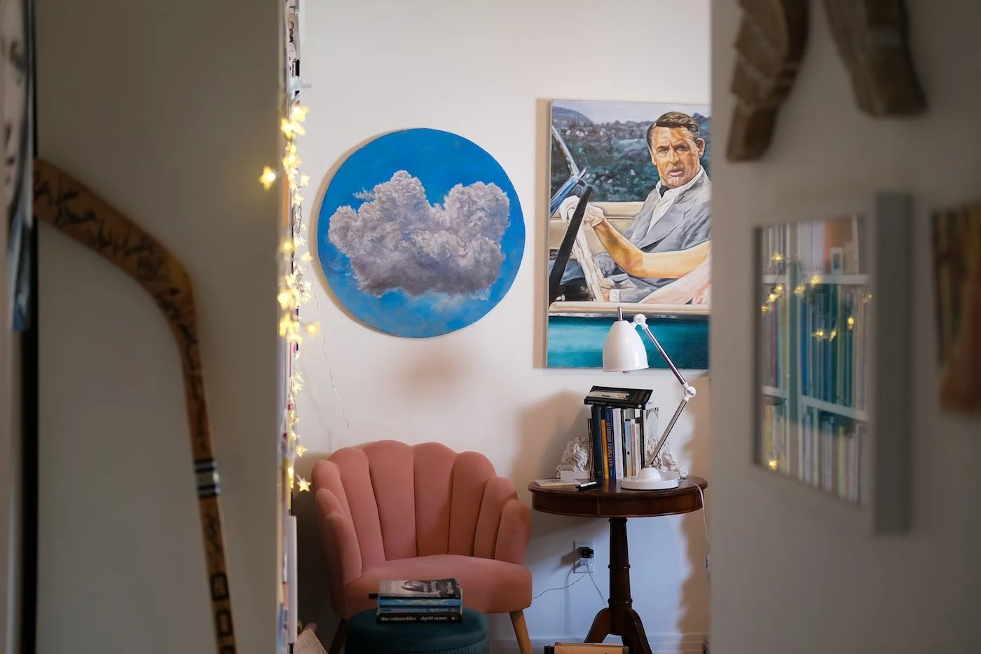And when you redecorate a bit, move things around (re: my theme song, Raise a Little Hell), new things might emerge. In this case, the books from my shelves are reflected in the glass of the frame. (Which I think you can see in a couple of the images below).