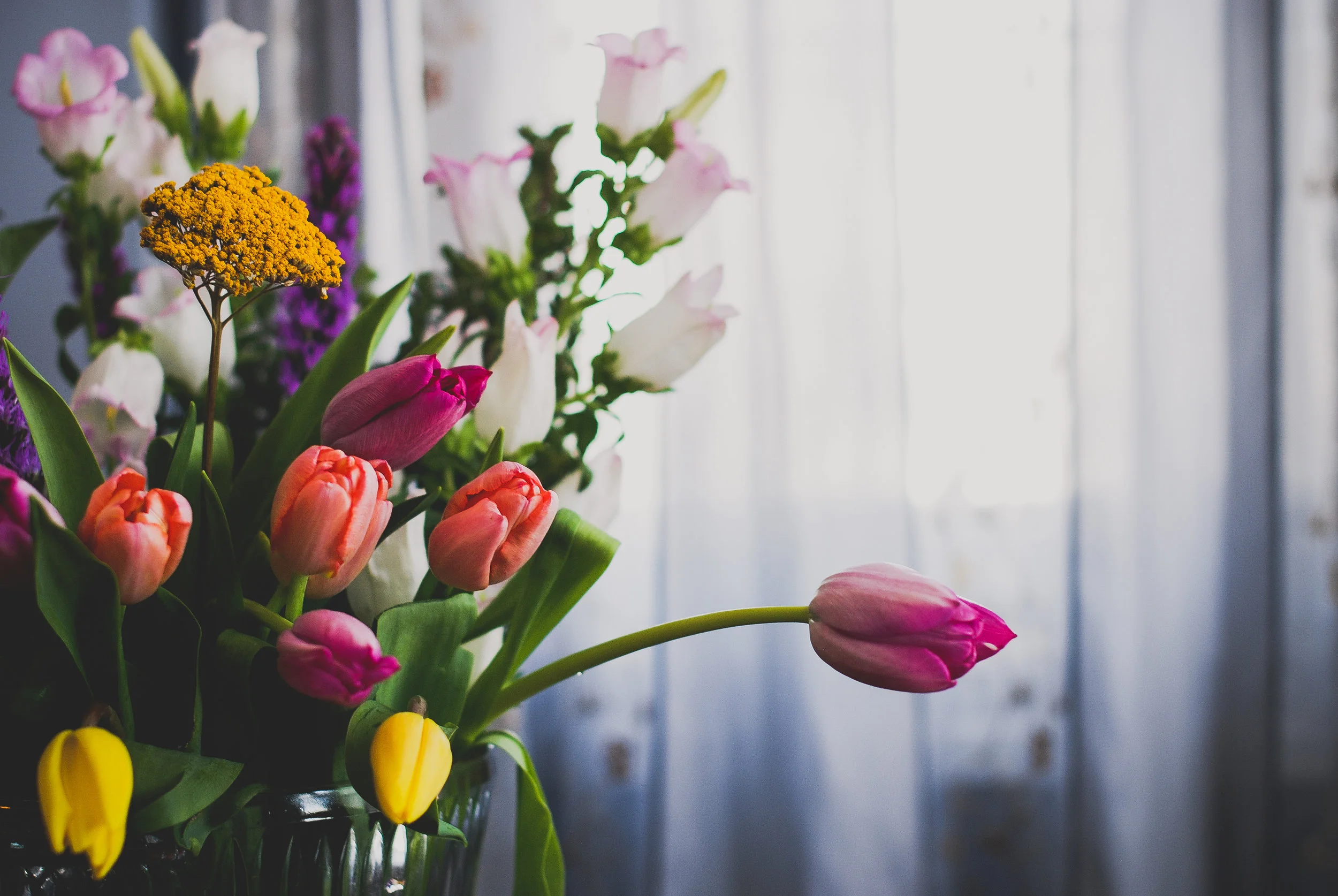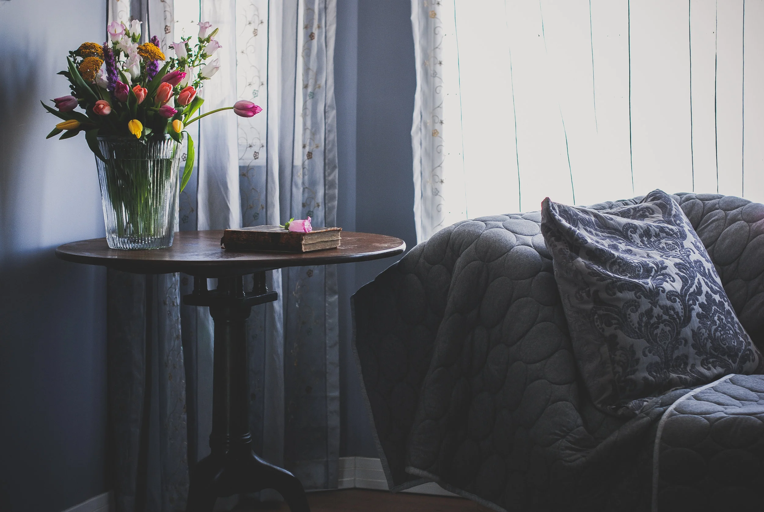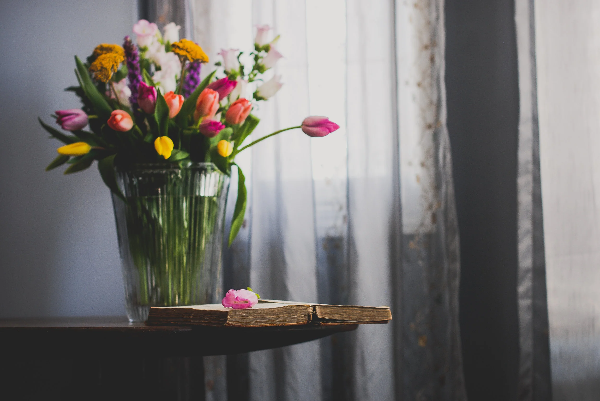 The first day of Spring has come and gone and here there is still a lot of snow on the ground. On the day itself, which also happened to be a day off from the library for me, I went out and bought flowers, an extravagant amount from Safeway, and there was light in the house. I remembered an old table Rob had in his studio, one that served as his kitchen table when he first moved out. He brought the dusty old thing up into our bedroom, which seems to be where I often photograph things these days. After weeks of insomnia, and being otherwise too busy, I've been feeling as though I've lost the thread to the creative life. Anyway, the table, the flowers, playing with my usual light source but in a new way, all these things reminded me of the mystery of light, the mystery of things and flowers, again. Which reminded me of a piece I wrote ages ago, referencing Karin, Boye, Joseph Campbell, Clarice Lispector, and James Joyce. Here it is: