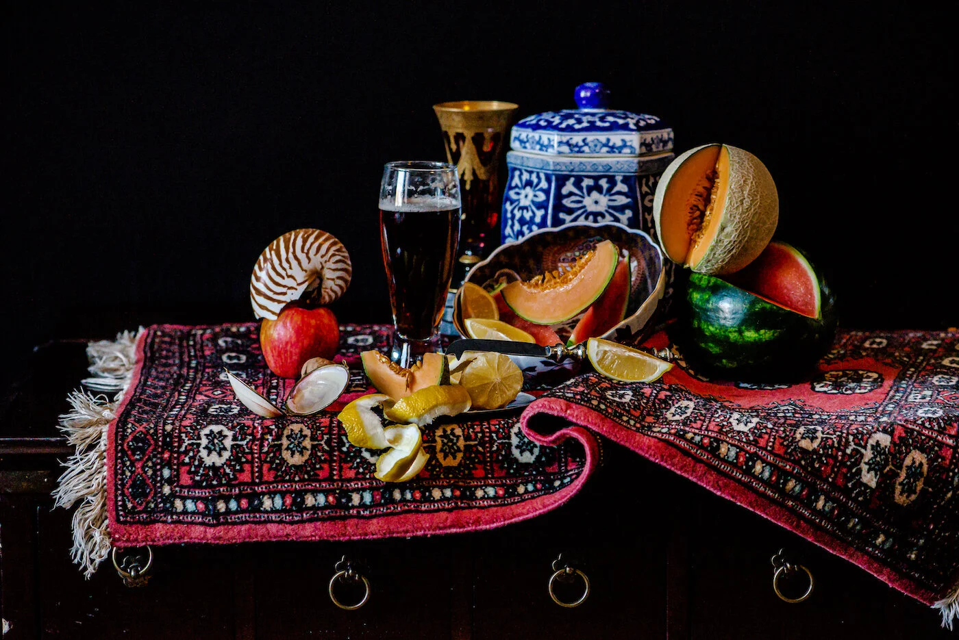 I’ve been thinking about my process of taking these still life photos, the way it starts off maybe with a single object that calls to me. A lemon that I’ve sliced open, or a a cantaloupe. Maybe I look at an image of a painting from the 17th century and then I notice I also have a melon or a nautilus shell. I start to gather things and then I see where the composition takes me. I arrange and rearrange. The first image I set up is usually not the best one. I add, I subtract. I rearrange. I cut into fruit, I slice. Sometimes things fall off the table. Others are propped up at a certain angle. I play. I hurry, I wait. The sun comes, the sun goes.