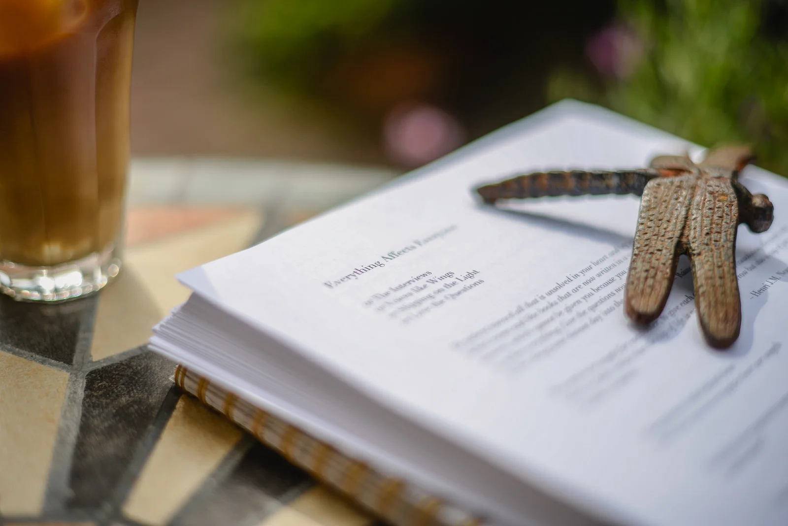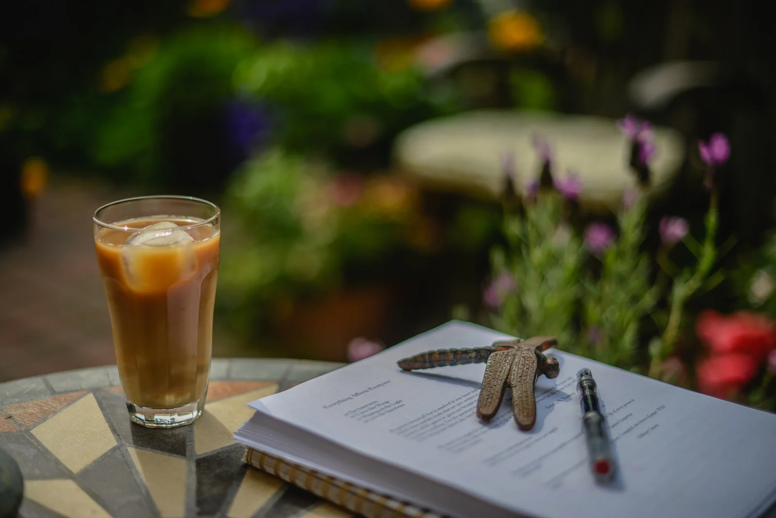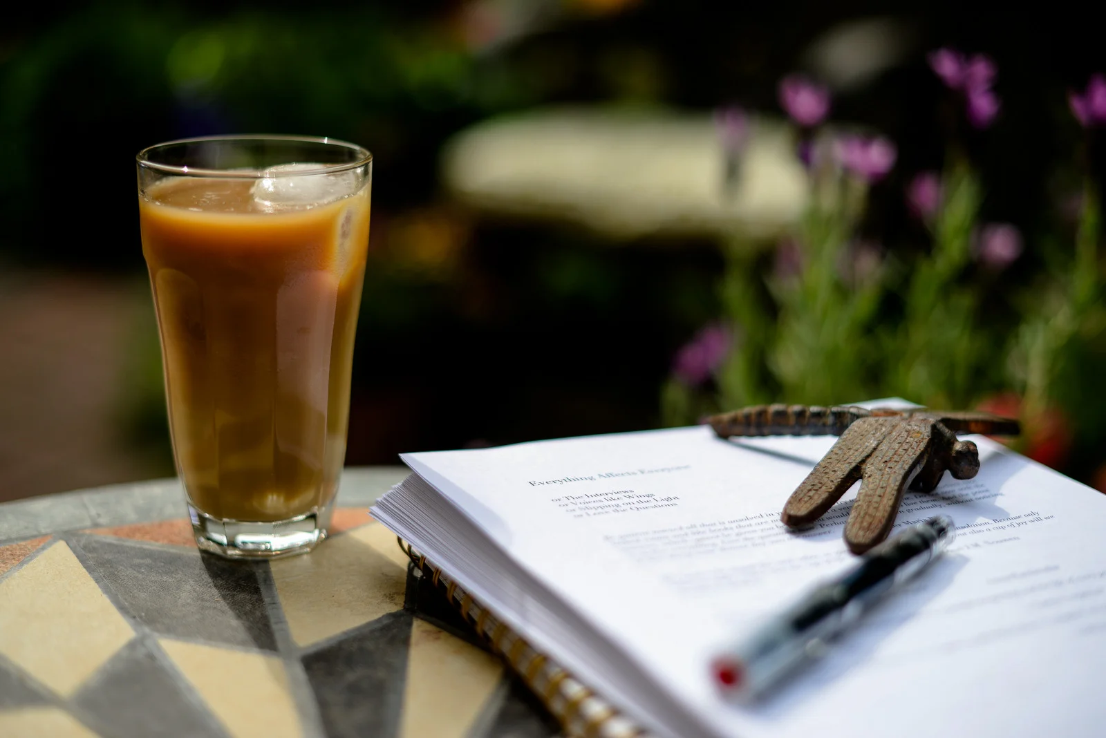 So amid all the rubbish weather we’ve been having, there was a morning where I took my novel, freshly printed draft, outdoors, with iced coffee. It was nice enough for about an hour before the wind came up, the rain, etc. I moved indoors, and made it through the first section, taking notes, thinking. It too, is rubbish, at this point. Though parts of it sing, parts of it sway. I can only make myself as comfortable as possible while I see this through.