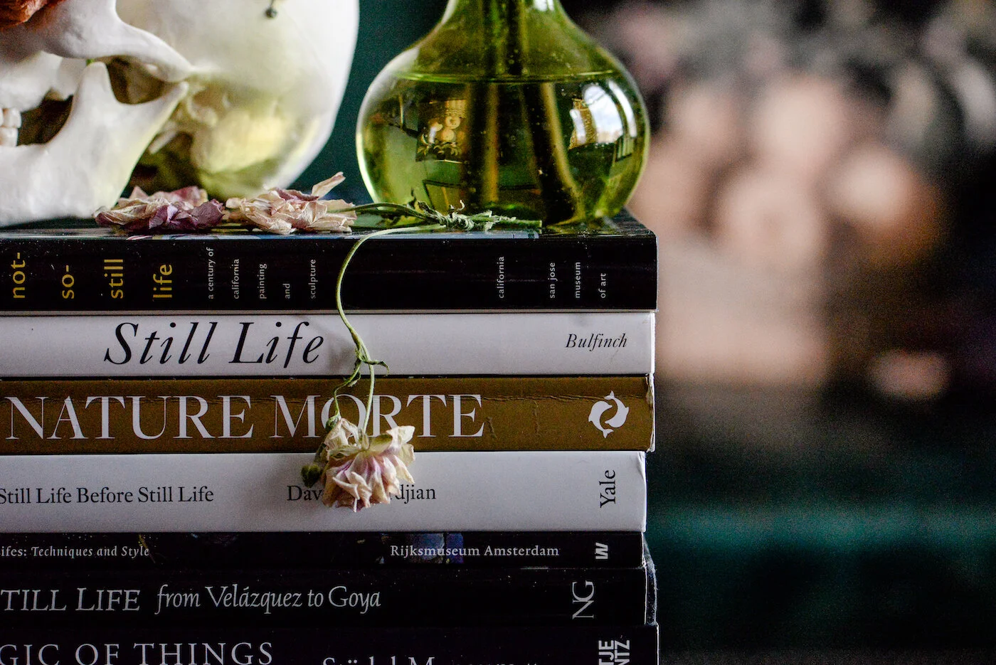The beauty of a still life is that while it may more overtly say, “memento mori,” (in the case of my skull photographs) many traditional still life objects, flowers, remind us that tempus fugit. We have the beauty of the blooms, in floral still lifes, which will not last, often in combination with perishable food and fruit. There are very often precarious items placed, and the disruption of cats, or yapping dogs. Because life is precarious, and full of unknown interruptions and disruptions, loud noises, the unexpected.
