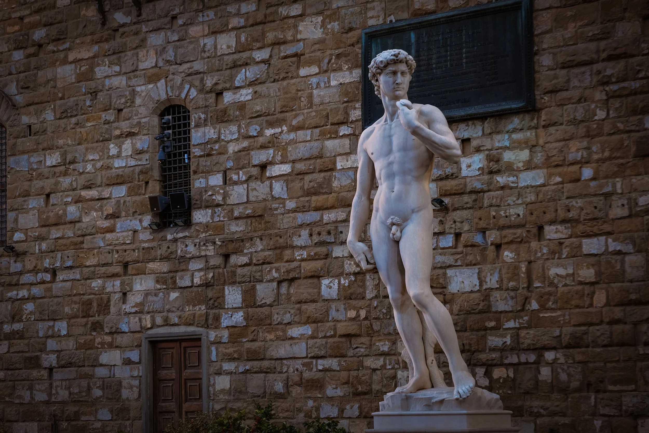 The photograph below is by me from our trip to Firenze in November. I’m going to look at a sculpture in this post rather than a picture, per se, and that is the copy of Michelangelo’s David which is in the Piazza della Signoria in front of the Palazzo Vecchio. The original was moved to the Accademia in 1873.